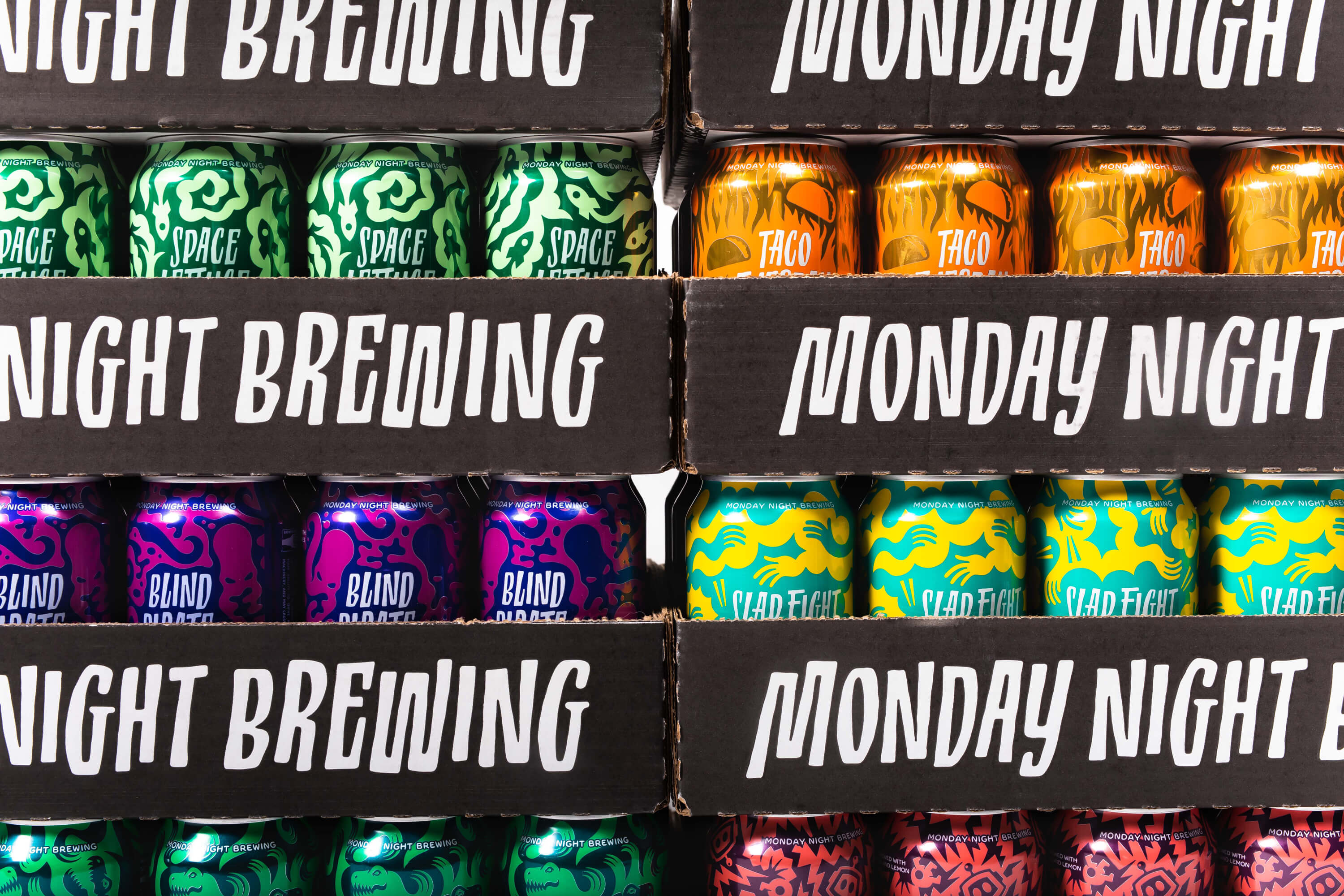 Monday Night Brewing needed a new brand to capture not just the creativity and craftsmanship of the beer, but the genuine enthusiasm and humor of the people behind it. That shows up in a new, hand-drawn logo and a custom typeface, both created specifically for the brewery. Inspired by the day/night contrast in the brewery's name, each can features an illustration style built on negative space.